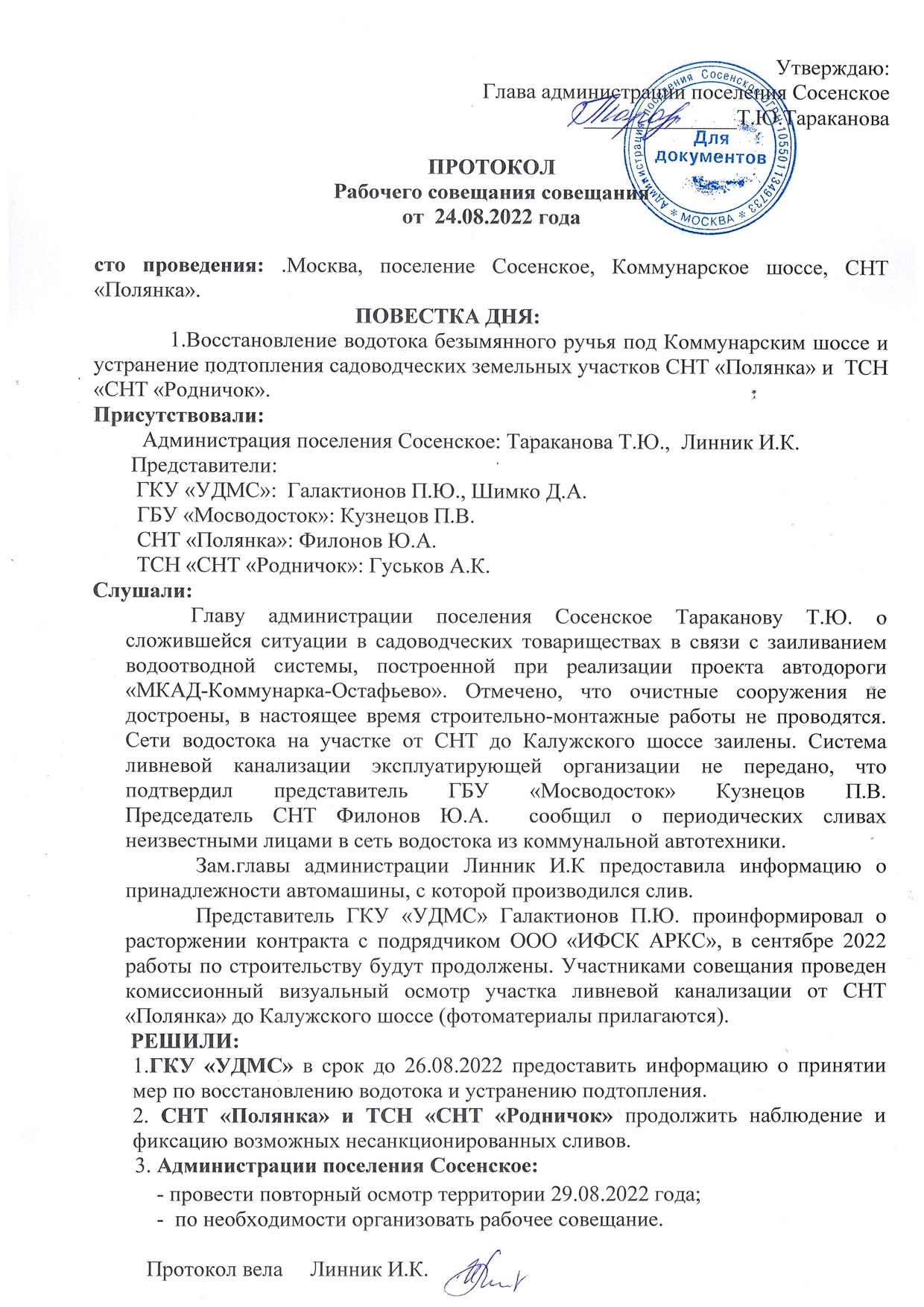 Протокол 24.08.2022 СНТ Полянка, УДМС, адм. Сосенское подтопление авг. 2022 водопропускная труба 2000Скачать