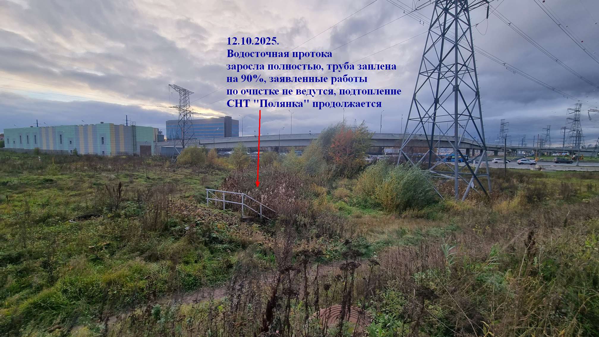 Несмотря на что в ноябре 2025 г протоку частично очистили, это не привело к снижению уровня на территории СНТ Полянка, т.к. прочистка внутри трубы не произведена. Также протока расчищена не полностью, уровень наносов на выходе из трубы остается более полуметра.